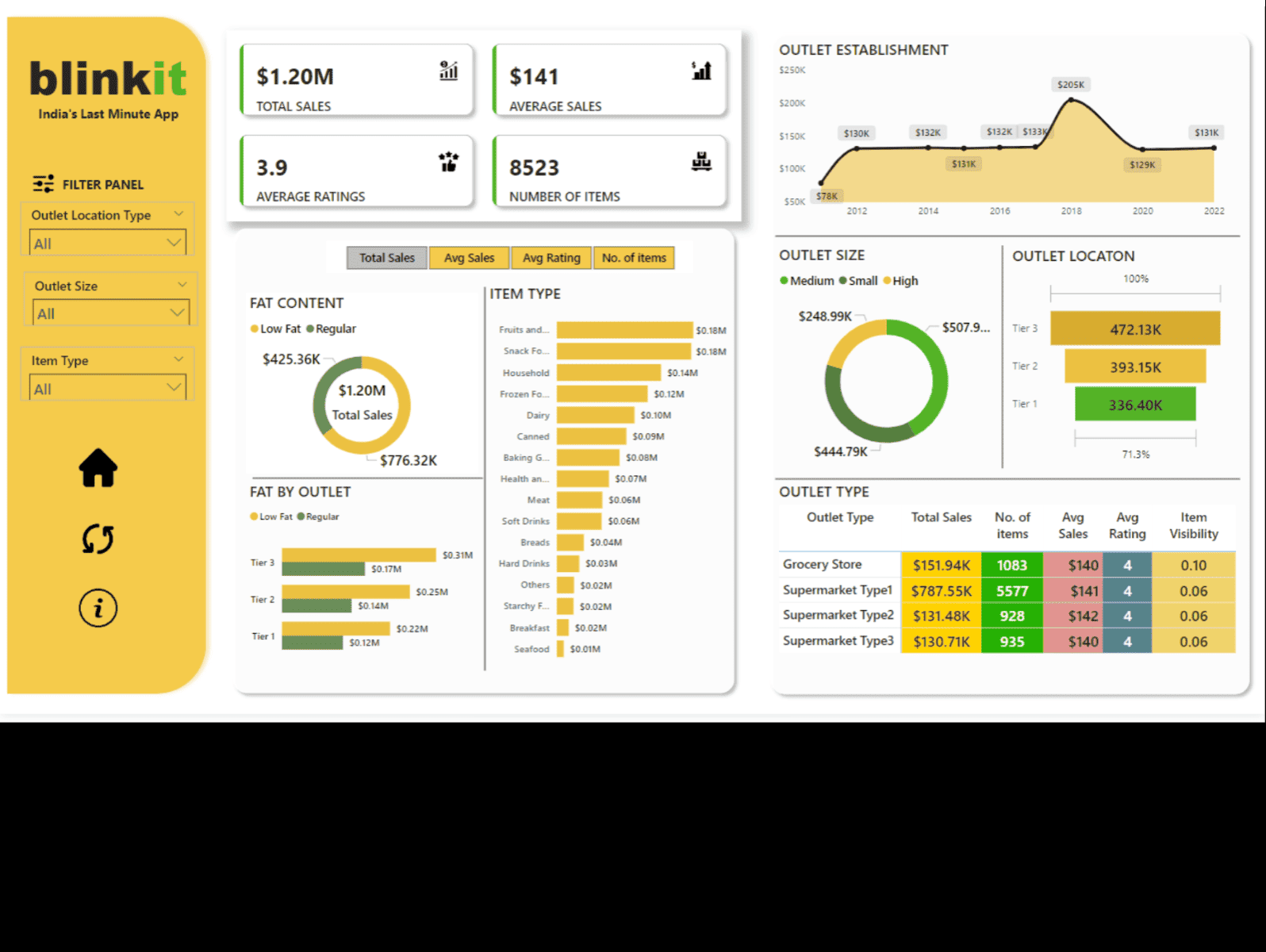 Created an interactive Power BI dashboard analyzing $1.2M in total sales across multiple outlets, item categories, and customer ratings.