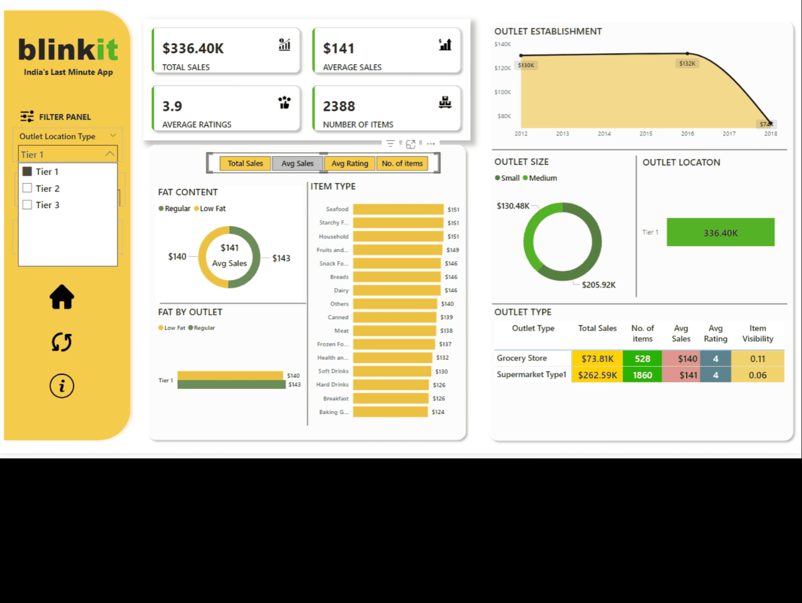 Enabled dynamic filtering by outlet size, type, and product fat content, allowing granular sales performance analysis.