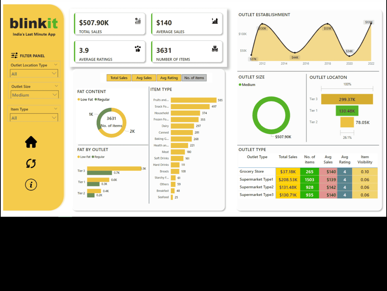 Presented insights through 6 KPIs and 10+ visuals, including sales trends by outlet type, location, and item type.