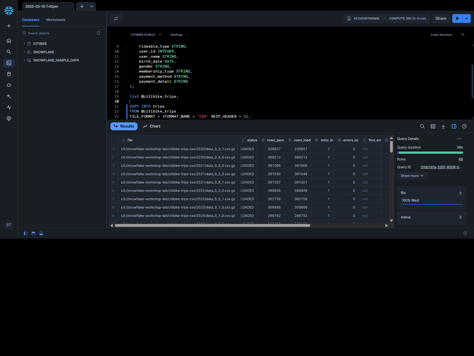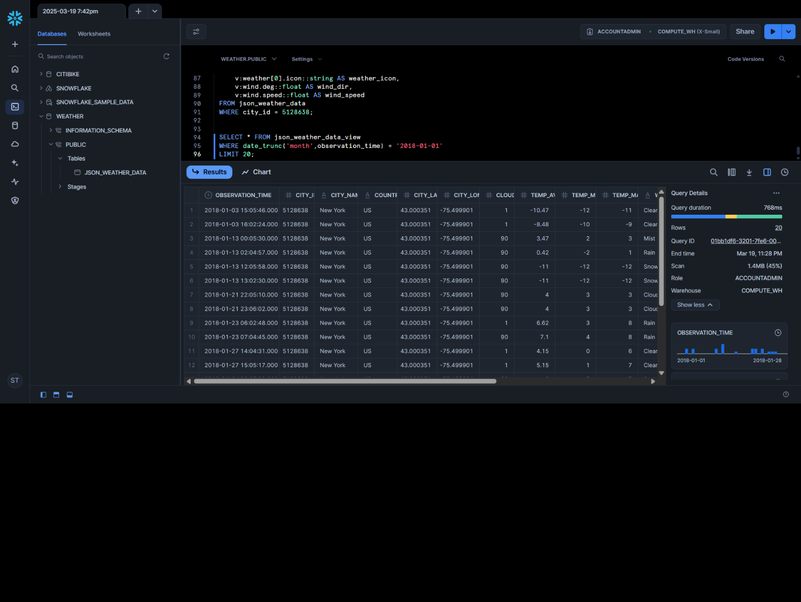 Loaded data with custom CSV file formats, performed SQL aggregations, and utilized Time Travel in Snowflake with the COMPUTE_WH warehouse.