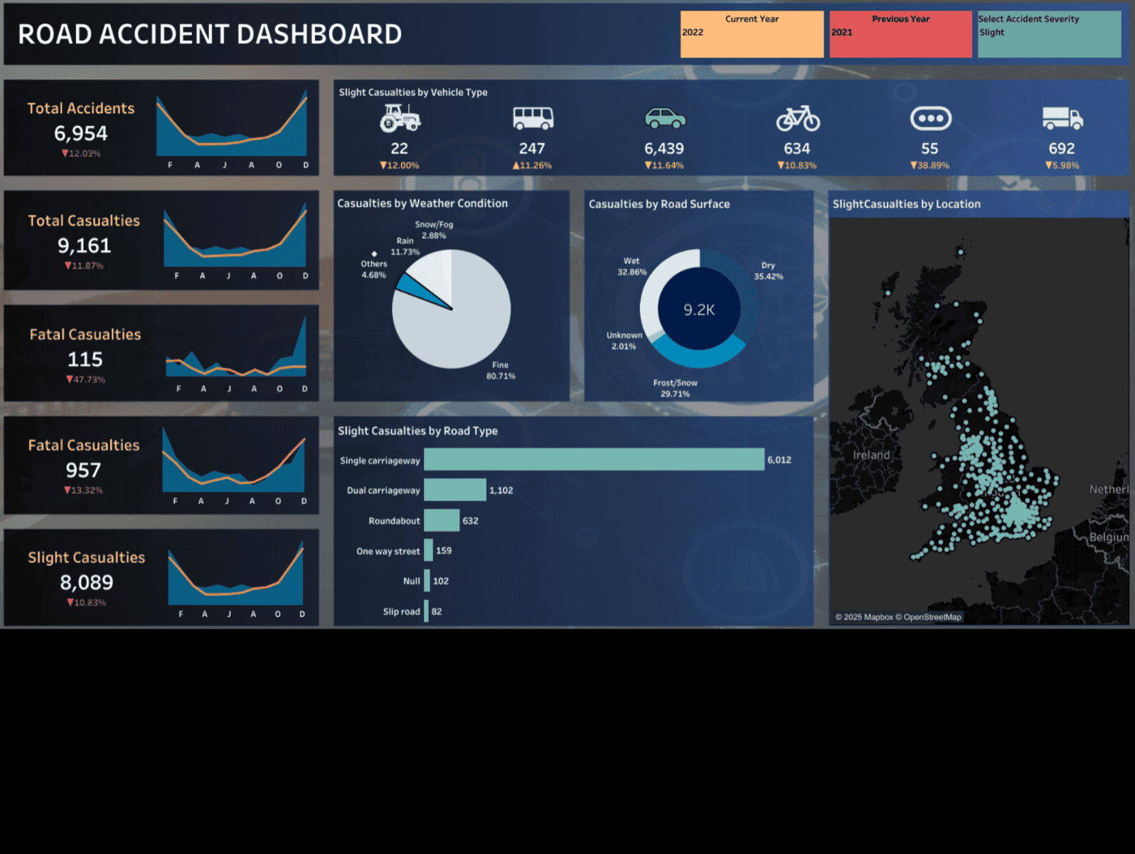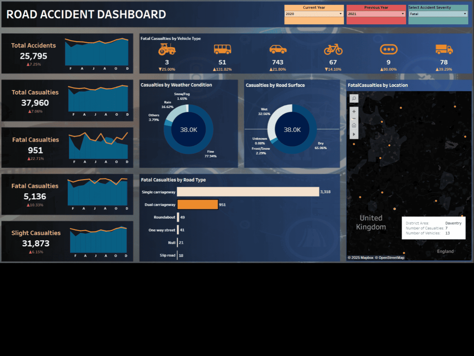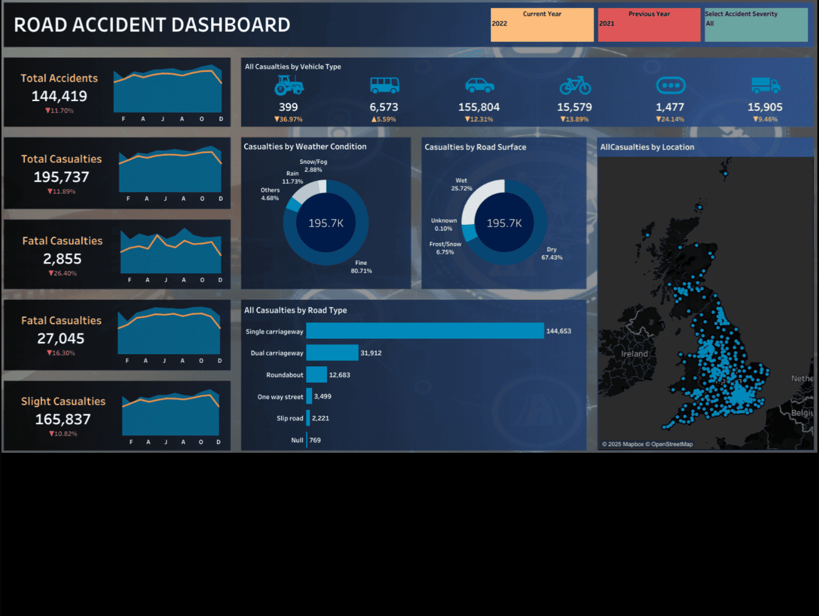Developed a Tableau dashboard analyzing over 800,000 road accident records, showcasing 6 KPIs and 8 visuals on trends by weather, road type, vehicle, and location.
